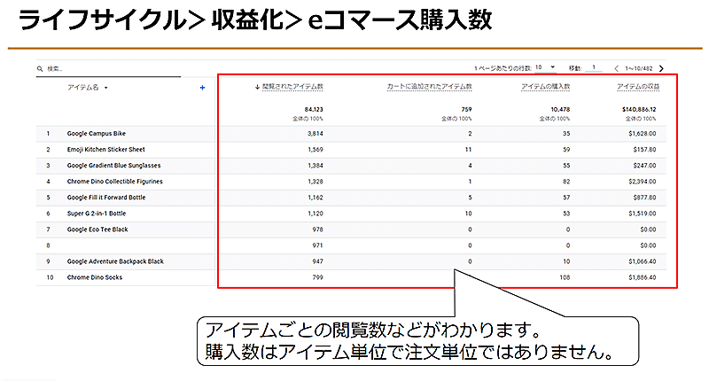 「ライフサイクル>収益化>eコマース購入数」のレポートは、商品の閲覧数、カートに追加された数、購入数などがわかります。購入数はアイテム単位で、注文単位ではありません。