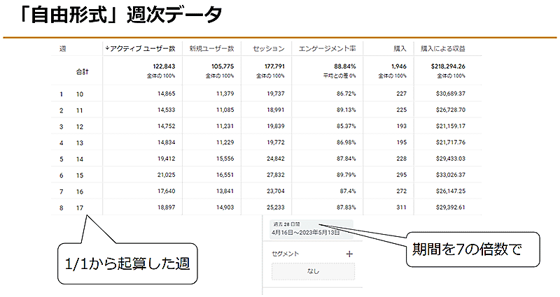 週次データを取得する際のポイントは、期間を「7の倍数にしておくこと」です。そうしないと、数値がずれてくるので必ず7の倍数にしましょう。