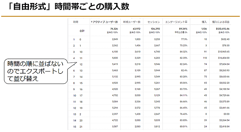 時間帯ごとの購入数のレポートを作る際はデータのエクスポートが必要