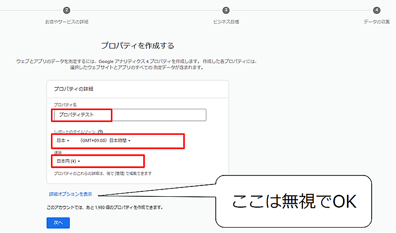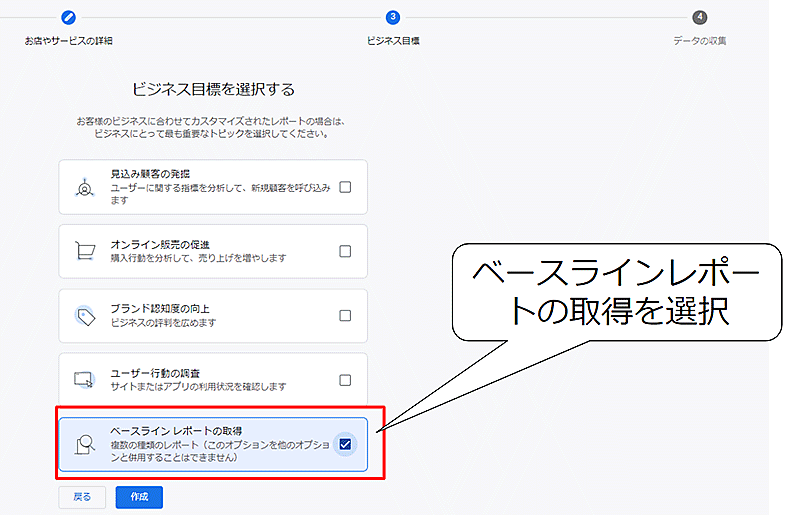 プロパティの作成:ビジネス目標は「ベースラインレポートの取得」を選択