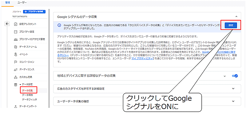 Googleシグナルは、設定画面で「データ設定」の「データ収集」を選ぶと表示されます。ここで「Googleシグナル」をオンにしておきましょう。オンにすることで、ユーザーの年齢、性別が取得できます。さらにGoogle広告に情報提供しているユーザーが、パソコンとスマホのどちらのデバイスで見ても、1人のユーザーと見なしてくれます。