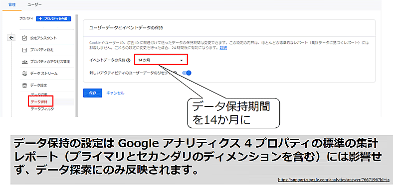 データ保持期間:「探索」で作成するレポートが対象で、標準レポートは対象外