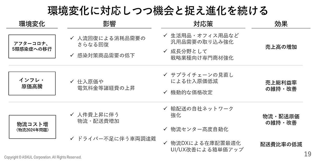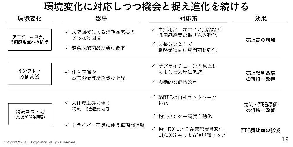 アスクルは、アフターコロナ、インフレ・原価高騰、物流コスト増といった外部環境の変化を成長機会と捉え、変化対応で進化を続けていく方針。