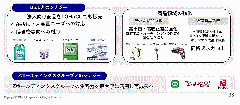 「LOHACO」では、BtoBで販売している大容量の業務用商品を個人向けに開放。業務用・大容量ニーズ、低価格志向へ対応する。また、家庭用品、ガーデニング、DIYといった高単価・高収益商品を取り扱い販売領域を広げる。日用消耗品を中心にBtoBの規模を生かしてオリジナル商品を強化、価格訴求力を向上する。