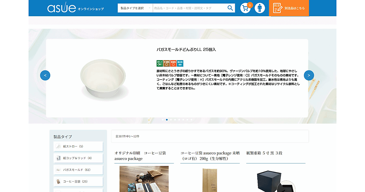 文具大手のナカバヤシは7月5日、会員制の法人向けBtoB-ECサイト「asue オンラインショップ」を開設した。紙ストロー、紙コップ、バガスモールド、紙製包材、紙製重箱、木製カトラリーなど約420アイテムを扱う。