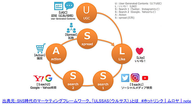 SNS時代の行動プロセスを表すマーケティングフレームワークの1つとして「ULSSAS」がある。