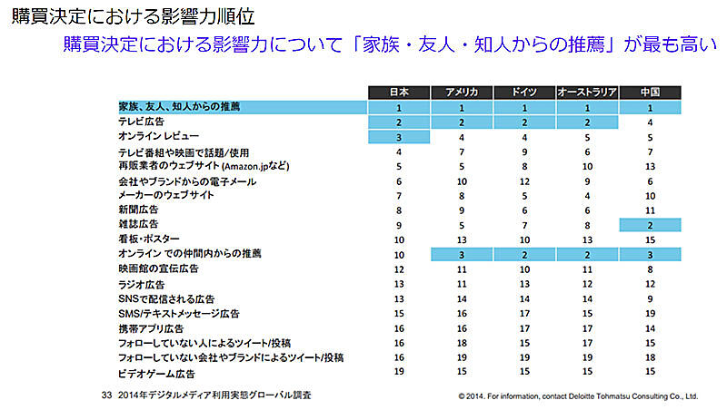 SNSが広く使われる時代においては、情報の信頼性が重要だ。家族、友人、知人から推薦された情報は影響力が高く、日本をはじめ各国で1位にランクされている。そのため、第三者からの声は購買決定における重要な情報となる。