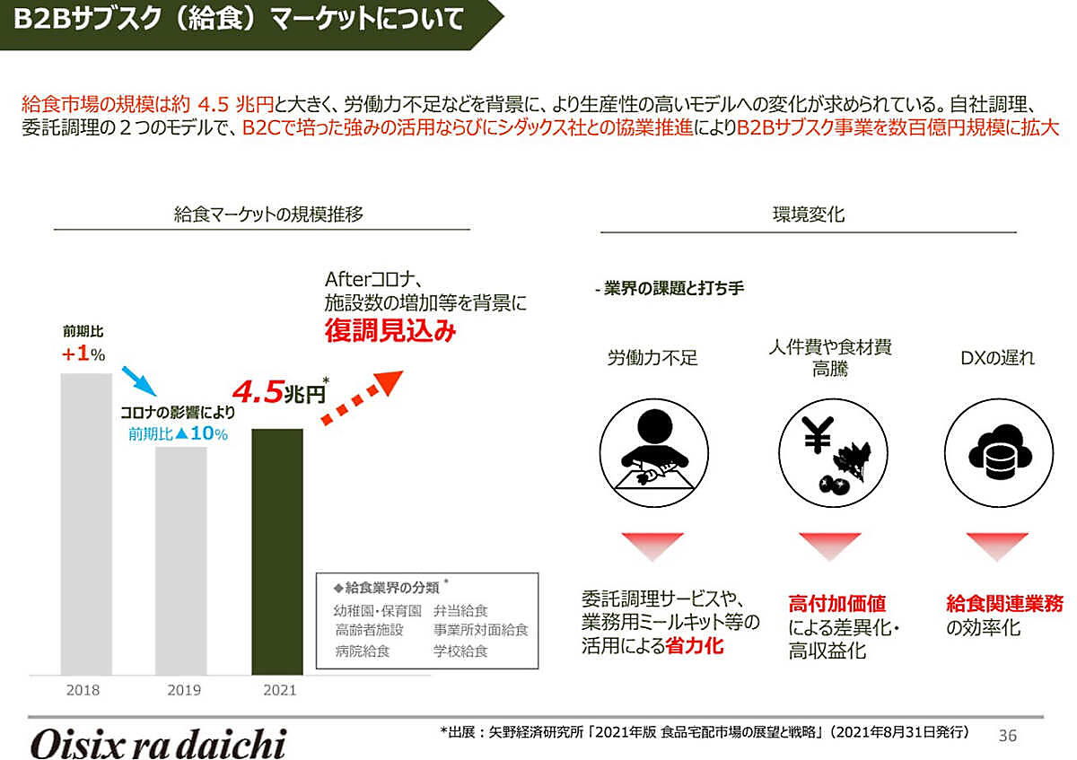 昨年10月にTOB(編注:株式公開買付)が成立して関連会社となったシダックスとの協業では、ミールキットを活用した受託調理を行う事業モデルを構築する。オイシックス・ラ・大地がシダックスに業務用ミールキットを卸販売し、シダックスが自前施設で受託調理する。