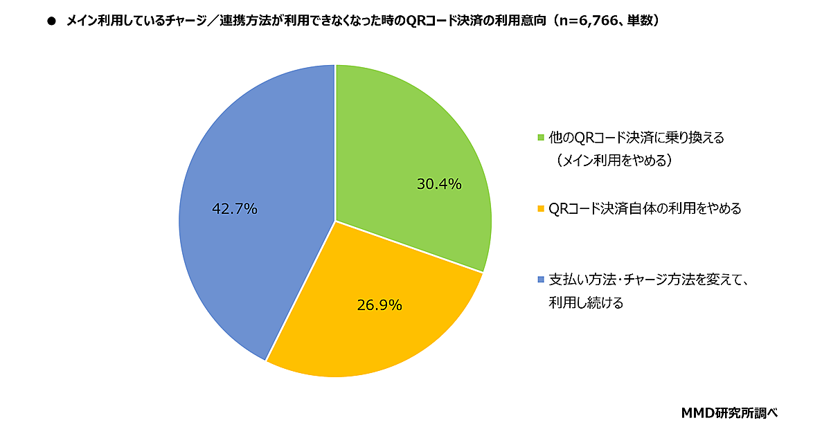 MMDLaboが運営するMMD研究所が実施した「QRコード決済サービスのチャージ・連携方法に関する調査」によると、メイン利用しているQRコード決済で最も利用しているチャージ・連携方法が使えなくなった場合、30.4%が「他のサービスに乗り換える」と回答した。