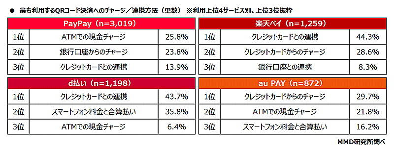 利用上位4サービスで見ると、各最多のチャージ・連携方法は、「PayPay」が「ATMでの現金チャージ」、「楽天ペイ」「d払い」は「クレジットカードとの連携」、「au PAY」は「クレジットカードからのチャージ」だった。