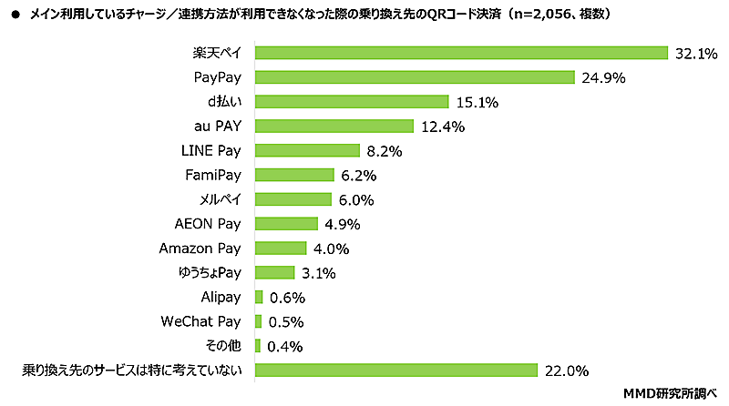 「他のQRコード決済に乗り換える」と回答したユーザーに、乗り換え検討先を聞いたところ、最多は「楽天ペイ」(32.1%)で、次いで「PayPay」(24.9%)「d払い」(15.1%)だった。