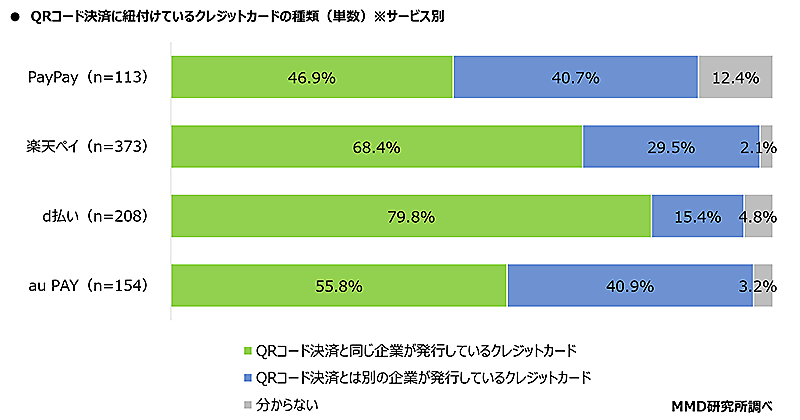 QRコード決済4サービスのメイン利用者かつチャージ・連携方法がクレジットカードのユーザーに、QRコード決済に紐付けているクレジットカードの種類を聞いたところ、「QRコード決済と同じ企業が発行しているクレジットカード」を紐付けている割合は、「PayPay」が46.9%、「楽天ペイ」が68.4%、「d払い」が79.8%、「au PAY」が55.8%だった。