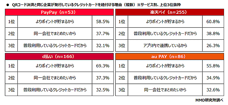 QRコード決済4サービスのメイン利用者かつQRコード決済と同じ企業が発行しているクレジットカードを紐付けているユーザーに、同じ企業が発行しているクレジットカードを紐付けている理由を聞いたところ、4サービスとも「よりポイントが貯まるから」が最多。「PayPay」「d払い」は「同一会社でまとめたいから」、「楽天ペイ」「au PAY」は「普段利用しているクレジットカードだから」が続いた。