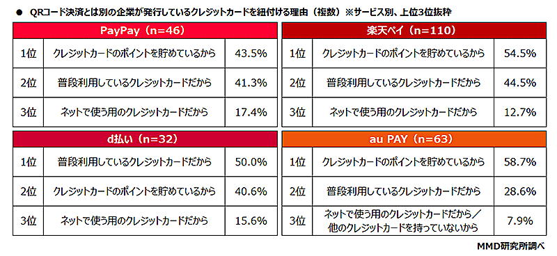 QRコード決済4サービスのメイン利用者かつQRコード決済とは別の企業が発行しているクレジットカードを紐付けているユーザーに、別の企業が発行しているクレジットカードを紐付けている理由を聞いたところ、「PayPay」「楽天ペイ」「au PAY」は「クレジットカードのポイントを貯めているから」、「d払い」は「普段利用しているクレジットカードだから」が最も多く、次いで「PayPay」「楽天ペイ」「au PAY」は「普段利用しているクレジットカードだから」、「d払い」は「クレジットカードのポイントを貯めているから」だった。