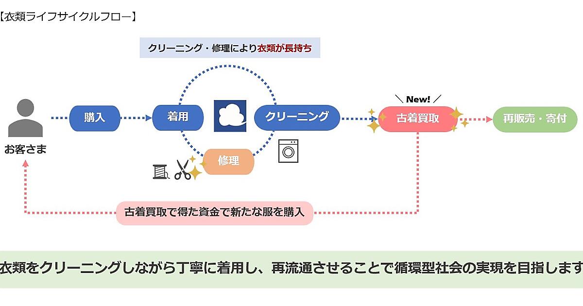 着用済衣類を白洋舍のクリーニング・リペア技術で修繕し、古着買取サービスで二次流通。持続可能な衣料品のライフサイクルを推進する。買い取りはまず白洋舍溜池サービス店から始め、今後取り扱い店舗を広げていく方針。
