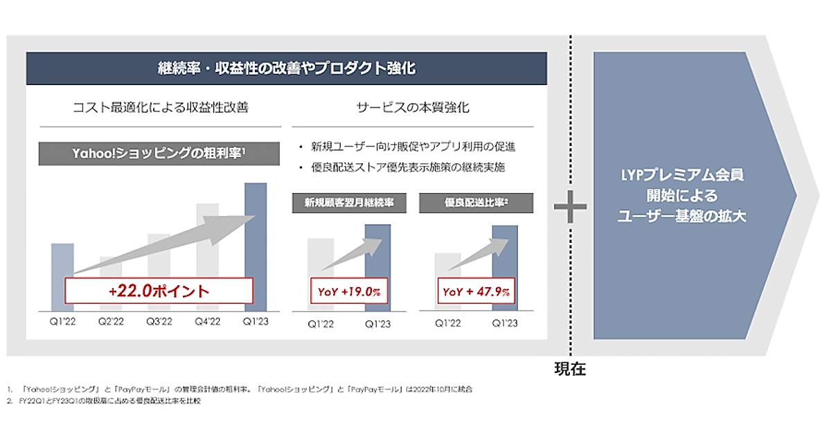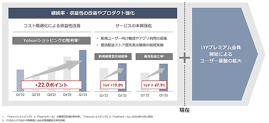 「Yahoo!ショッピング」では新規ユーザー向け販促やアプリ利用の促進、優良配送ストア優先表示施策の継続実施などでサービス面を強化。第1四半期における新規顧客の翌月継続率は同19.0%増、優良配送比率は同47.9%増だったという。