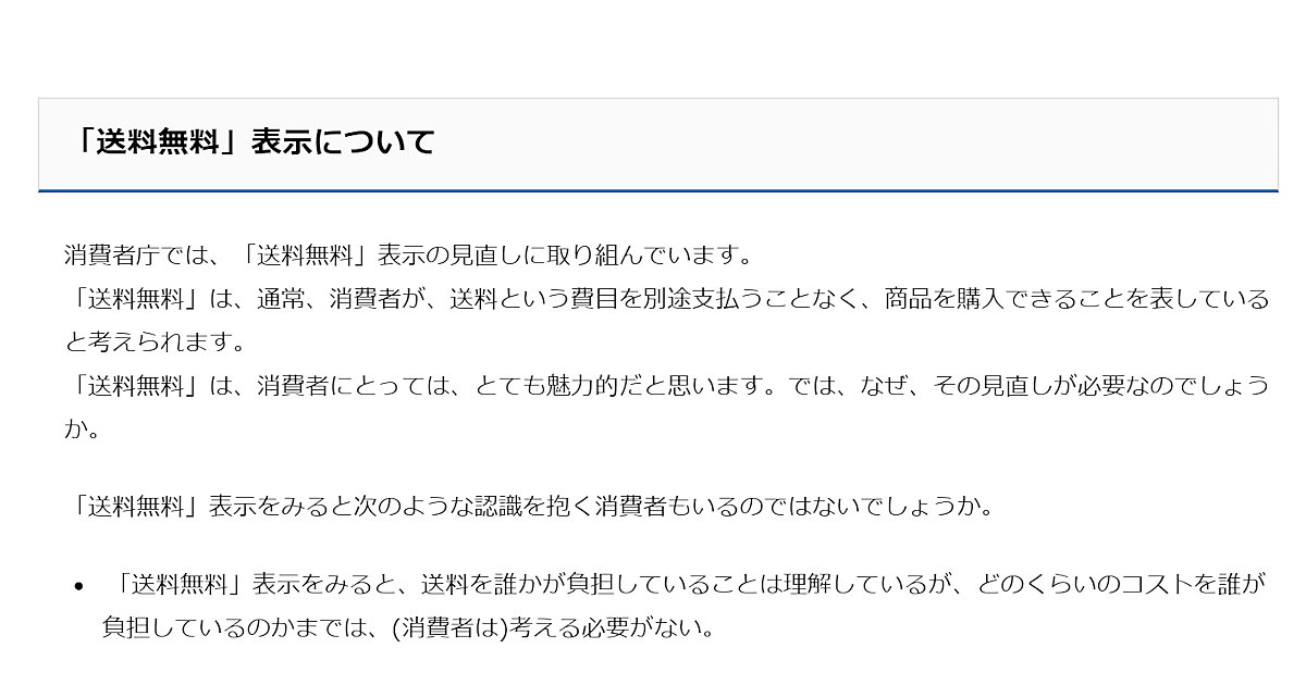 「物流革新に向けた政策パッケージ」では、「運賃・料金が消費者向けの送料に適正に転嫁・反映されるべきという観点から、『送料無料』表示の見直しに取り組む」と明記している。