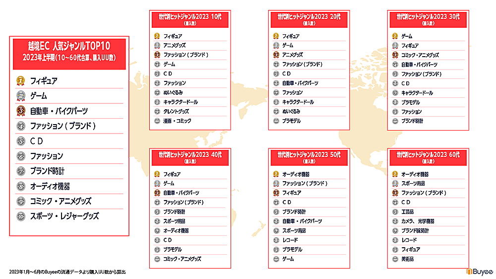 BEENOSが発表した「2023年上半期 越境ECトピックスレポート」によると、人気ジャンル1位は「フィギュア」、2位「ゲーム」、3位「自動車・バイクパーツ」がランクインした。