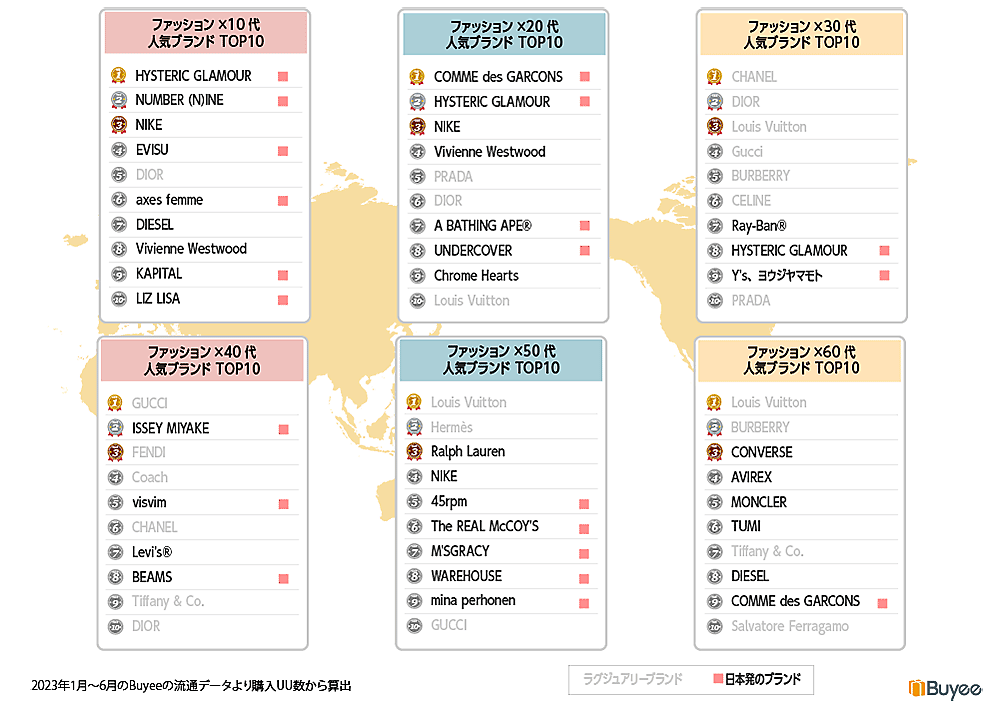 全世代共通で高い人気がある「ファッション」も世代ごとに特徴が表れた。各世代別に人気のブランドトップ10を見ると、10代・20代は日本のハイエンドブランドのシェアが高く、そのなかでも10代はドメスティックブランドが多く、世界観が確立されたブランドが人気だという。30代・40代はラグジュアリーブランドを求めていることがわかった。