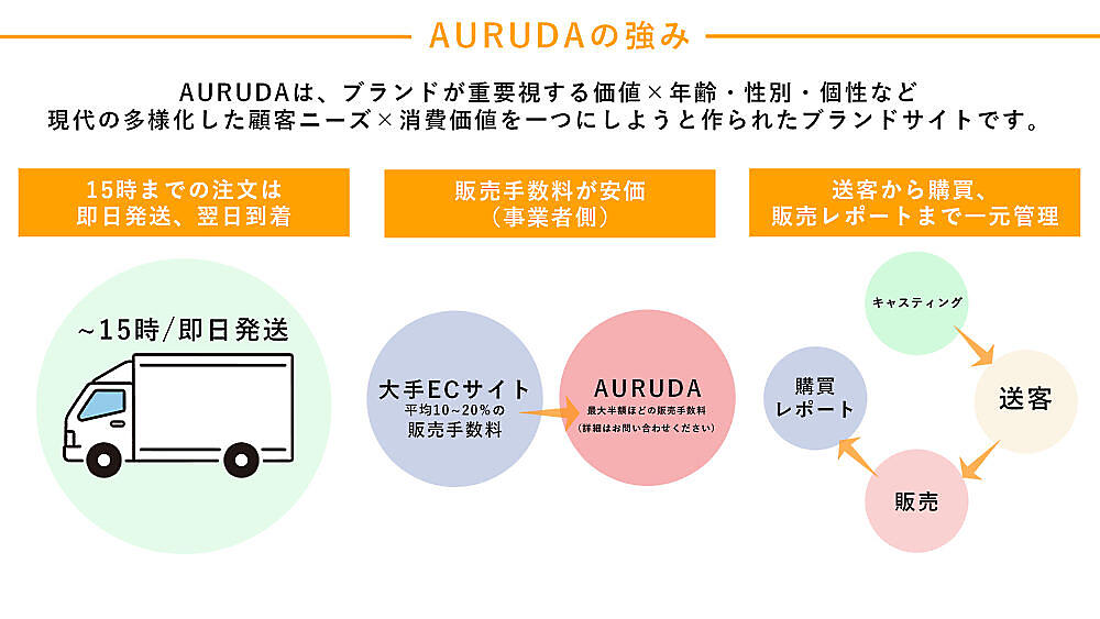 大手ECプラットフォームでは平均10~20%という販売手数料は、「AURUDA」は最大で半分程度にするという。