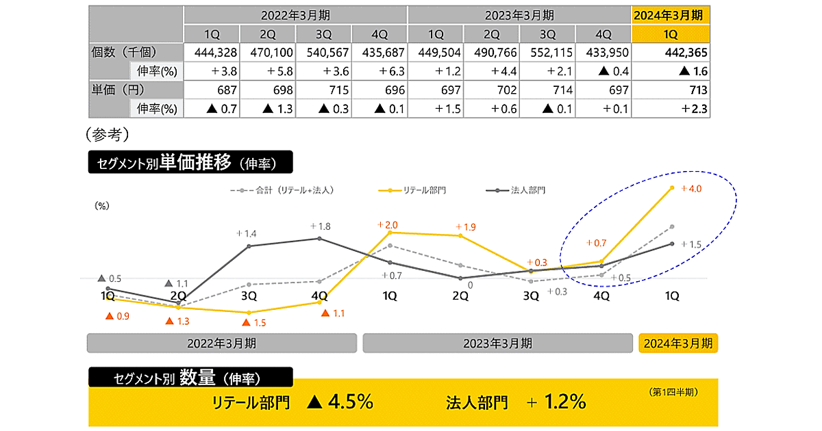 リテール部門の平均単価が先行して上昇しているが、法人部門のお客さまとの交渉も着実に進めており、全体の平均単価は、第2四半期以降も個別契約の更新時期に合わせて、段階的に上昇していくと想定している。