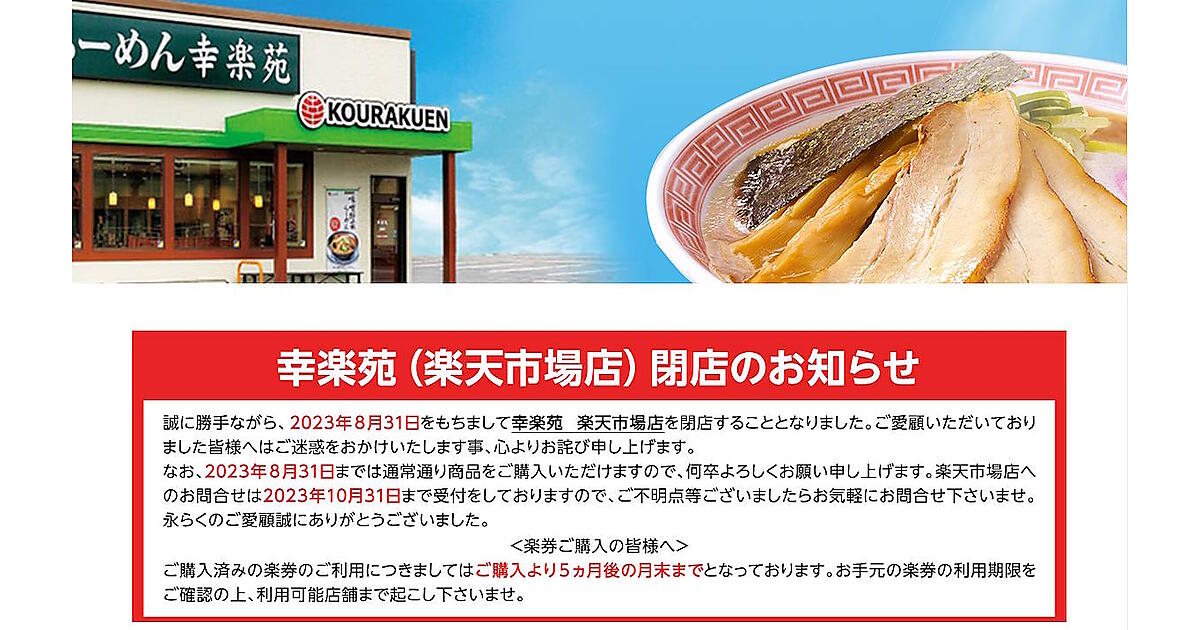 通販事業部は11月1日付で廃止する。「幸楽苑 楽天市場店」「幸楽苑 Yahoo!ショッピング店」は8月31日に、「幸楽苑 Amazon店」は9月30日に閉店する。