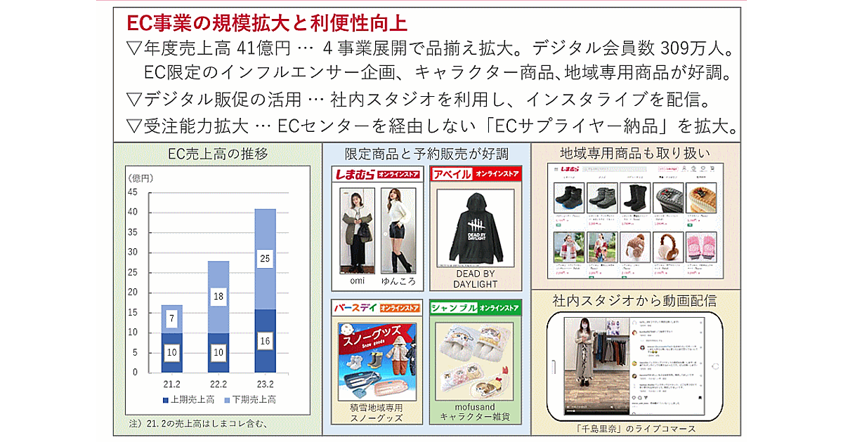 店頭受取の比率などは2023年2月期の数値で、EC事業の売上高は前期比46.4%増の41億円だった。金額ベースでは同13億円の増加。