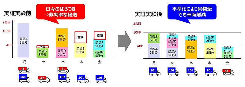 実証実験を通じて発注量の平準化を図ったことで、輸送に用いる車両数の削減、同一の物量に対する排出CO2を削減する成果を得たという。