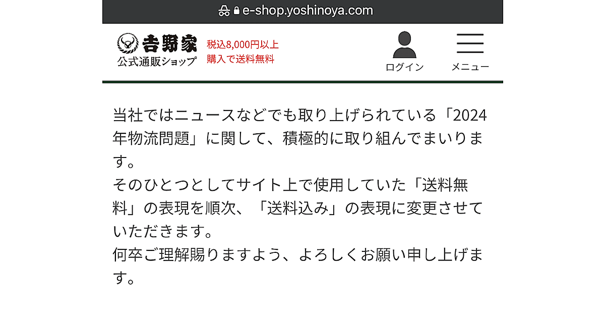 吉野家の「送料無料」表記の変更は、多くのユーザーが利用する「楽天市場」の名称に合わせたと推測される。吉野家は「『送料無料』の表現を順次、『送料込み』の表現に変更する」とし、「2024年物流問題」に関して積極的に取り組むとしている。