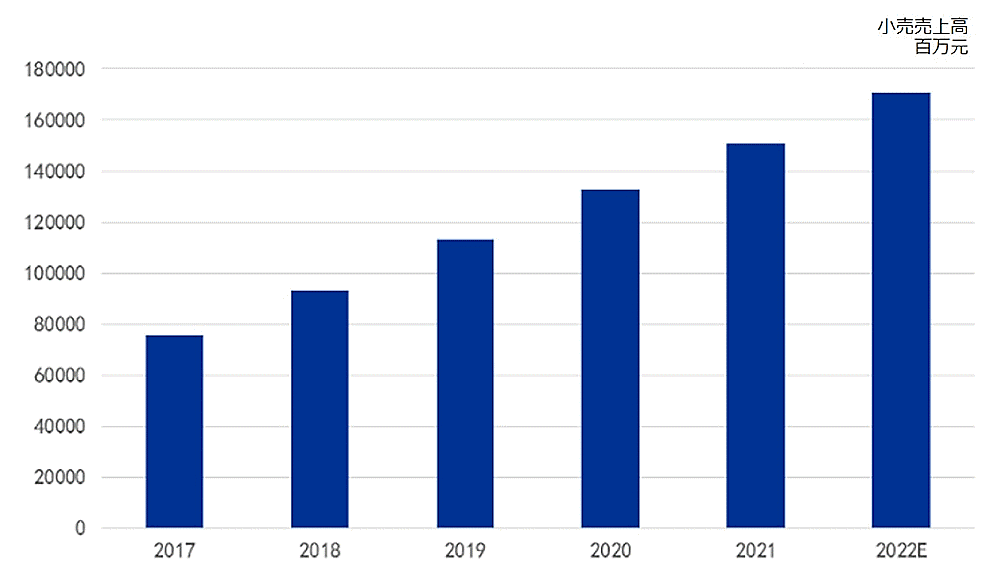 なかで最も大きいのがペットフードカテゴリー。中国の2017~2021年におけるペットフード小売売上高は年平均25.1%で伸び、2022年は542億元(約1兆961億円)に達しました。そのうち犬猫フードが541億元(約1兆941億円)と99%近くを占めています。