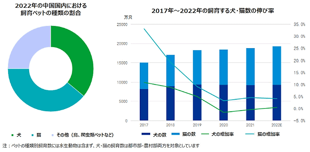 オンライン・オフラインのペット産業市場(ペット用品のほかペット医療など関連産業も含む)が高い成長率で伸びており、2021年の市場規模は1500億元(約3兆336億円)に拡大。2022年には1706億元(約3兆4502億円)に成長したと見られており、「エンプティネスト経済」の進展で今後さらに大きくなると予想されています。