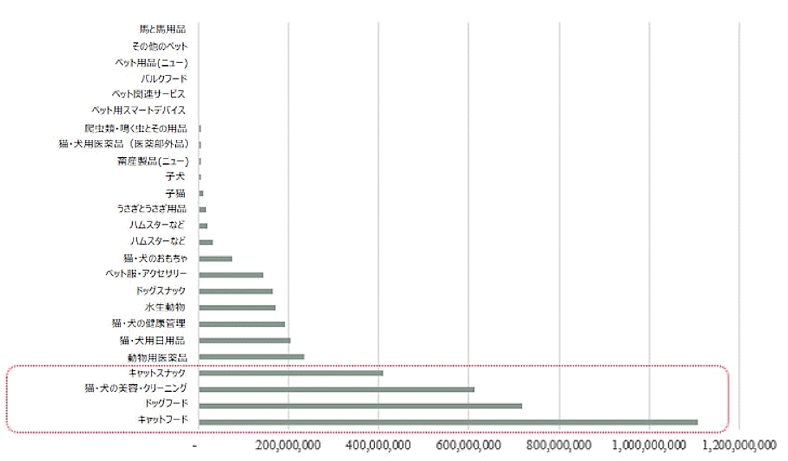 ペットカテゴリーの主なサブカテゴリーは「キャットフード」「ドッグフード」「猫・犬の掃除用品」「猫のおやつ」です。