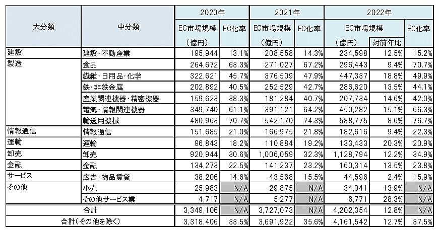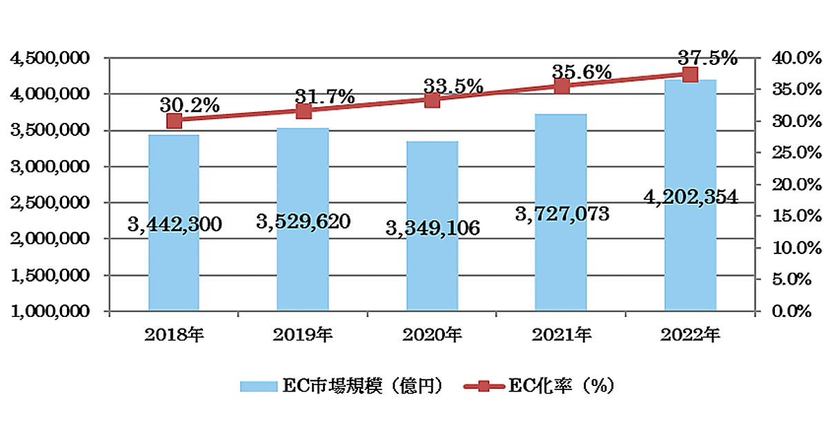 経済産業省の調べによると、2022年におけるBtoB-EC(企業間電子商取引)の市場規模は420兆2354億円で前年比12.8%増。EC化率は37.5%で同1.9ポイント増だった。