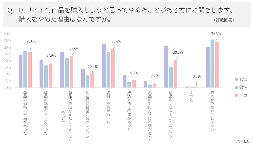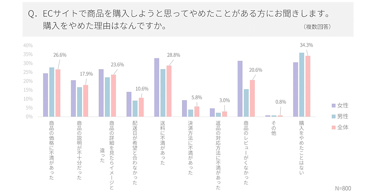 システムインテグレータが公表した「EC消費者意識調査レポート」(対象はEC利用者800人)によると、ECサイトで商品購入をやめた理由のトップは「送料に不満があった」(約3割)だった。