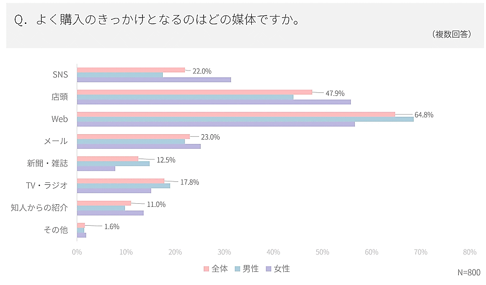 商品購入のきっかけとなる媒体は「Web」で64.8%と最多。「店頭」が47.9%、「メール」が23.0%、「SNS」が22.0%で続いた。