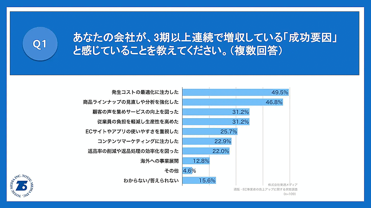 東通メディアが、3期以上連続で増収している通販・EC事業者109人を対象に、売り上げアップに関する実態調査によると、その成功要因は「発生コストの最適化に注力した」が49.5%で最も多かった。