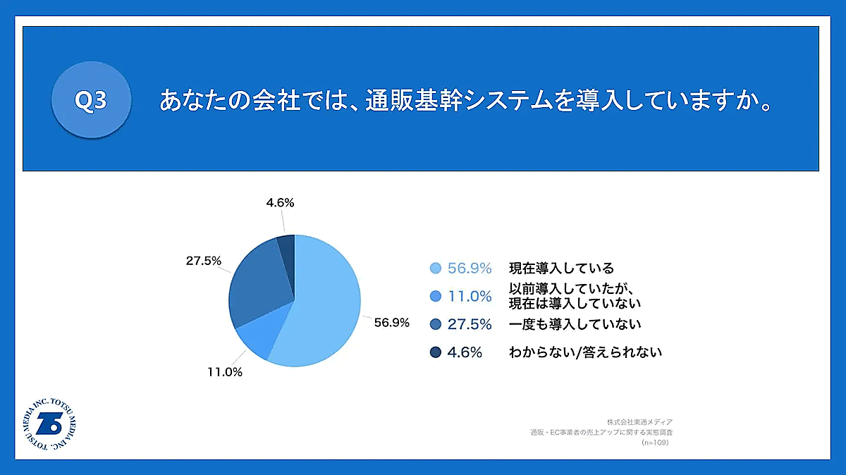通販基幹システムの導入状況についても聞いた。「現在導入している」は56.9%で、「以前導入していたが現在は導入していない」が11.0%、「一度も導入していない」が27.5%で続いた。