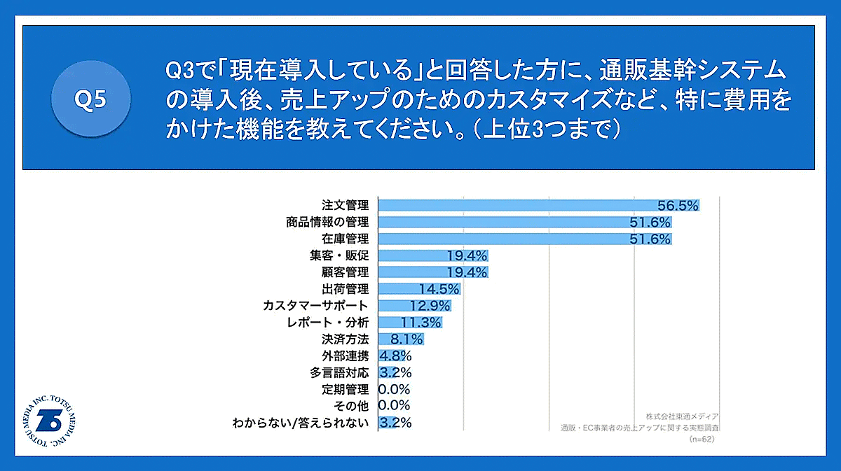 また、売上アップのためのカスタマイズなど費用をかけた機能(上位3つまで)については、「注文管理」が56.5%、「商品情報の管理」が51.6%、「在庫管理」が51.6%だった。
