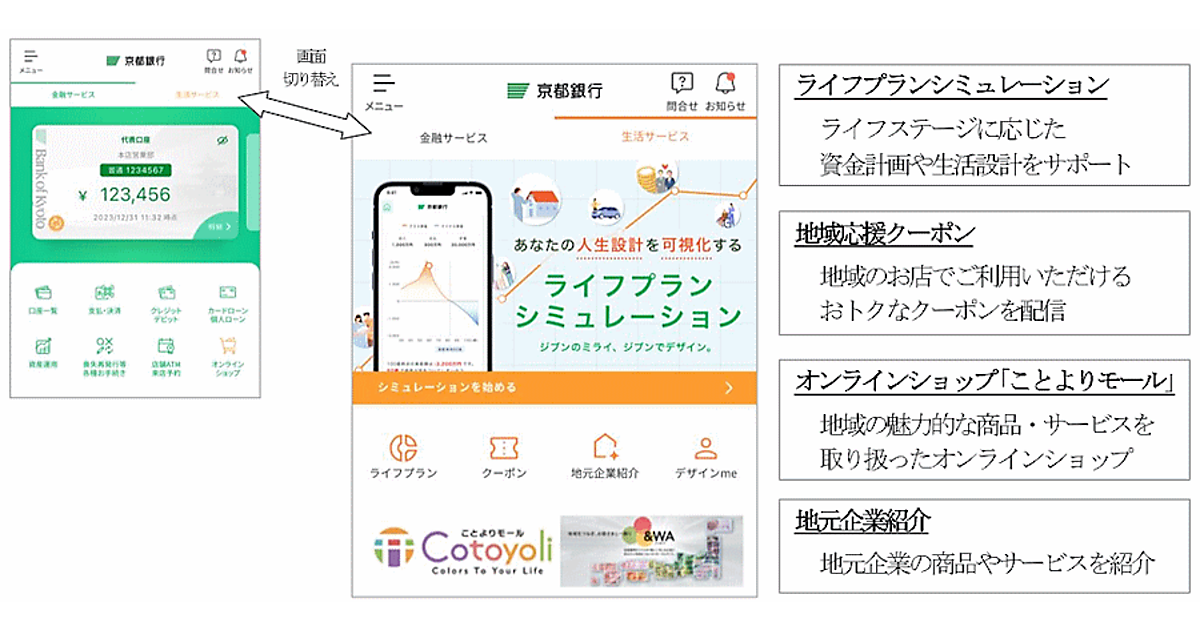 9月13日から個人顧客を対象とした生活総合サービス「京都くらしのサイト」の提供を始める。グループ企業の烏丸商事が運営するECモール「ことよりモール」、地域企業のクーポン情報、生活設計のサポートや暮らしに役立つ情報を配信していく。京都銀行と取引のない個人も利用できる。