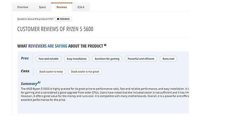 Newegg Commerceは商品ページの上部で、その商品のカスタマーレビューの特徴をAI生成ツールがいくつかのセンテンスに言い換えた“要約レビュー”を掲載。この要約レビューは、「Summary AI」と名付けています。