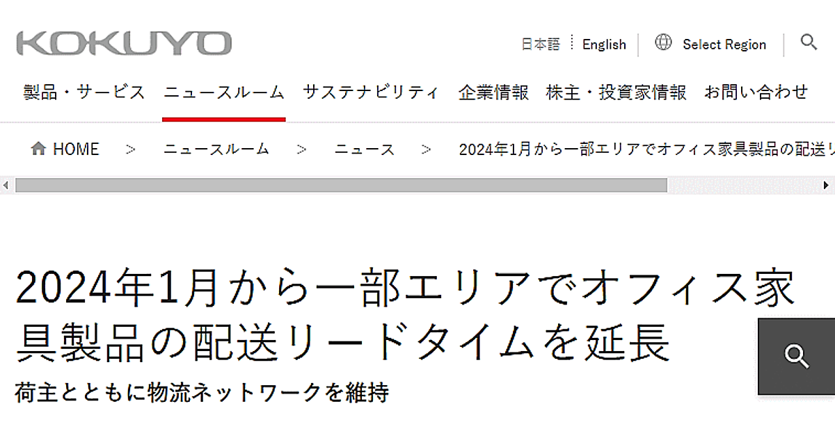 コクヨは2024年1月から、長距離輸送が必要となる一部エリアでオフィス家具製品の配送リードタイムを1日延長する。対象地域は長距離輸送が必要となる東北・九州エリア、山口県下関市。