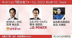 9月26日(火)・27日(水)の2日間で開催する「ネットショップ担当者フォーラム 2023 夏 BtoB-EC Days」では、アスクル、大都、富澤商店が登壇、「BtoB-ECマーケティング」「プラスの価値を提供する仕組み&サイト作り」などについて解説します。2日間の13講演すべて無料で視聴できるイベントです。
