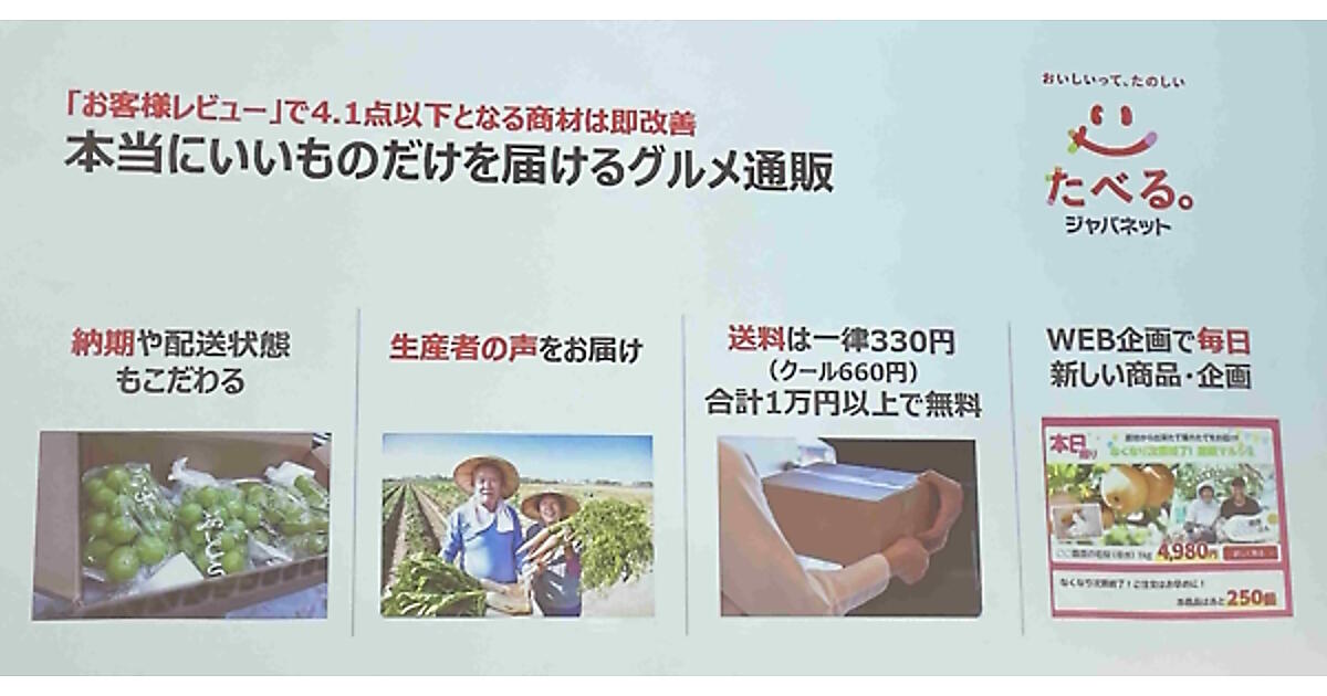「たべる。ジャパネット」では日本各地の生産者と直接、または全国農協食品ら食品流通会社から食品専用のバイヤーが「一定程度のランクで、かつ当該ランクとしては質の高いもの」といったある程度の量を確保できることなどを前提に厳選した食品を集中的に仕入れる。一定量をまとめて仕入れることで顧客が購入しやすい価格に抑えて販売する。取り扱い開始後もウェブサイトやコールセンターに寄せられる購入後の顧客からの評価をバイヤーと商品改善チームが目を通し、サイトなどに表示される顧客からの感想と星による評価「お客様レビュー」が5点満点中4・1点以下となった商品はすぐに見直しを行い、生産方法、収穫方法の改善、配送時の梱包状態、同封の調理説明書のわかりやすさや調理手順が適切かどうかなどチェックやヒアリングを行うなどして問題点を改善、場合によっては商品の入れ替えを行う。「家電と同様、様々な商品を販売するのではなく、当社が自信を持ってこれだと提案できるものをだけを価格はもちろん、納期や配送状態にもこだわって販売することで競合の多い食品通販でも勝負していく」と食品事業を統括する専門執行役員の塚本慎太郎氏は話す。