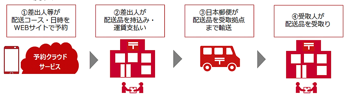 差出人は予約した郵便局に配送品を持ち込み、受取人は受取場所として予約した郵便局で予約情報を見せて配送品を受け取る。