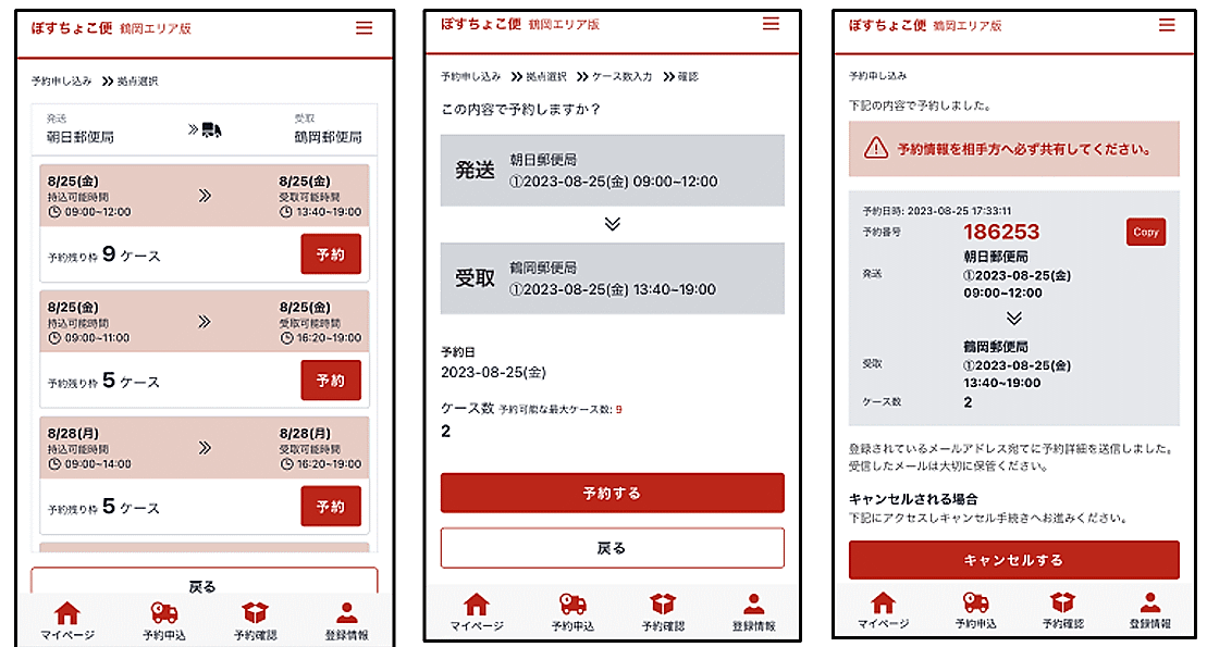 「ぽすちょこ便」の利用方法は、日本郵便の専用Webサイトで差出人または受取人がアカウントを作成し、空いている配送コースと日時を指定して予約。その後、予約者から配送の相手方に予約情報を連絡する。