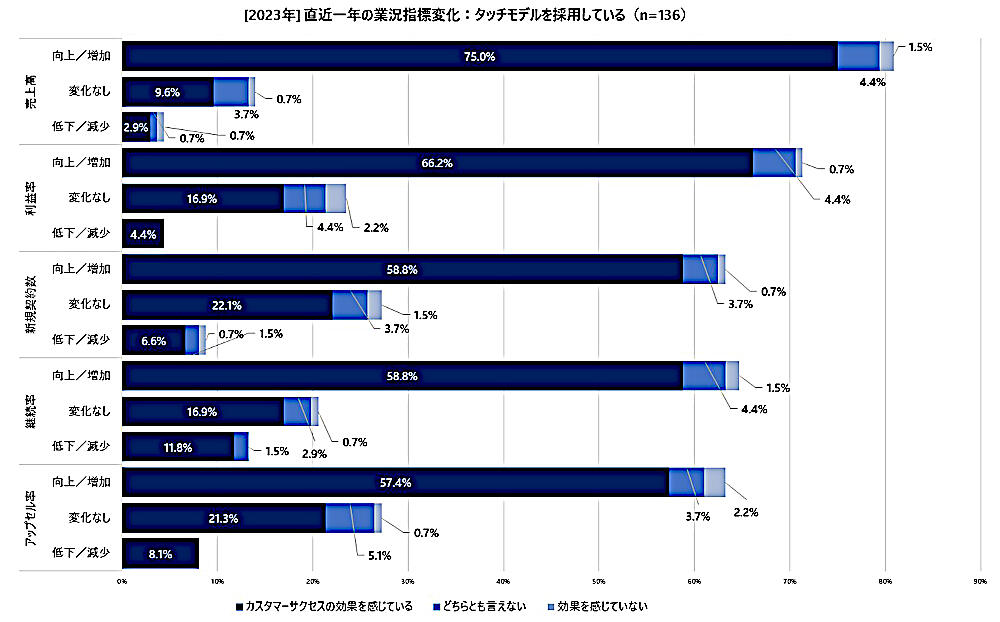 一方、タッチモデルを採用していない層では、各指標に対して「変化なし」の回答が多く、カスタマーサクセスに取り組んでいるものの、指標に変化が見られないことで「効果の有無はどちらとも言えない」と感じていることが推察される。