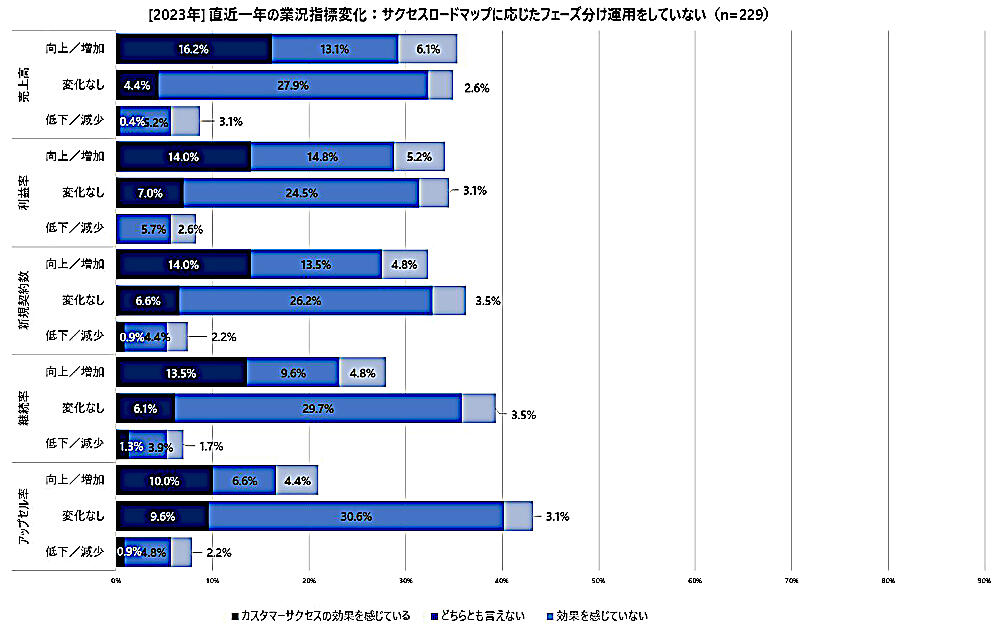 また、「サクセスロードマップに応じたフェーズ分け運用」を行っている層においても、各指標において直近一年で「向上した/増加した」という回答が多く、効果を体感している人が多いことがわかる。