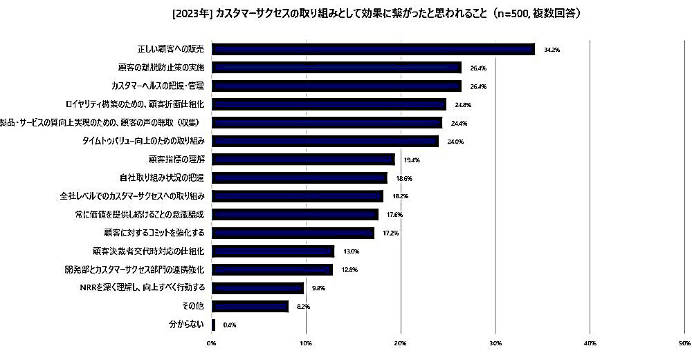 カスタマーサクセスの取り組みを行っているすべてのユーザーに「効果につながったと思われる取り組み」について聞いたところ、最多は「正しい顧客への販売」(34.2%)で、次いで「顧客の離脱防止策の実施」「カスタマーヘルスの把握・管理」(いずれも26.4%)だった。