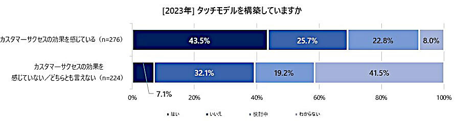 カスタマーサクセスの「効果を感じている層」と「感じていない/どちらとも言えない層」のそれぞれに、カスタマーサクセスの運用について質問。「効果を感じている層」の43.5%が「タッチモデルを構築している」と回答し、2022年調査の38.1%から5.4ポイントアップした。