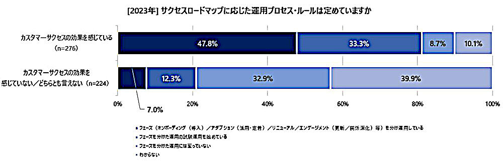 「サクセスロードマップに応じた運用プロセス・ルールは定めているか」について、「効果を感じている層」の47.8%がフェーズを分けた運用を実施。33.3%がフェーズ分けの試験運用を始めているという。